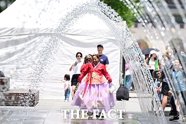 21일부터 민생회복 소비쿠폰 신청을 시작하는 가운데 외국인도 대상이라는 소식이 알려지면서 범위를 과도하게 넓혔다는 오해를 낳고 있다. 사진은 지난달 8일 오후 서울 종로구 광화문 광장 분수 터널을 찾은 외국인이 한복을 입고 기념촬영을 하는 모습. /남윤호 기자 |