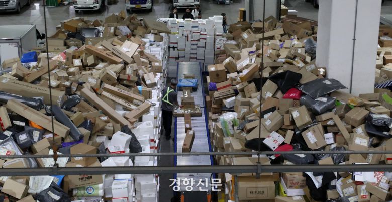 서울의 한 복합물류센터에 분류작업이 되지 않은 택배상자들이 쌓여 있다. 사진은 기사 내용과 직접적 관련 없음. 권도현 기자 |