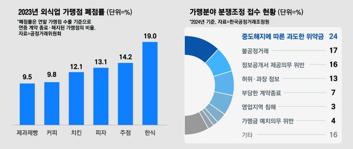 경영난 속에 가맹계약을 중도 해지하며 발생하는 분쟁도 많다. 한국공정거래조정원에 따르면 지난해 가맹사업 분야에서 접수된 분쟁조정 신청 584건 중 가장 많은 사유가 ‘계약 중도 해지에 따른 과도한 위약금 청구’(143건)로, 전체의 24%였다.