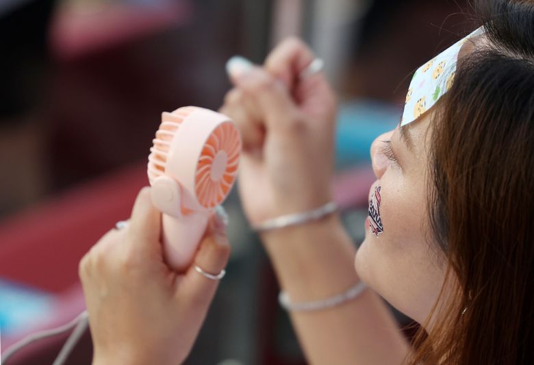 2025 KBO리그 경기에서 한 팬이 휴대용 선풍기를 들고 응원하고 있다. [뉴시스] |