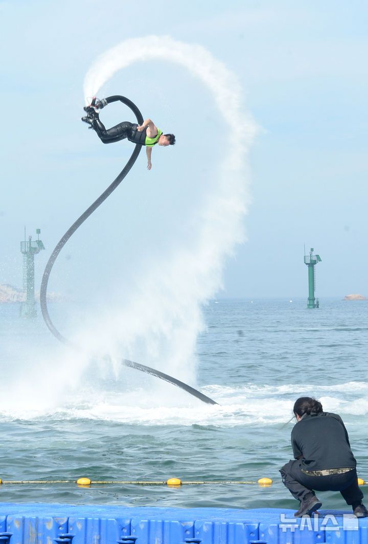 [울산=뉴시스] 배병수 기자 = 20일 울산 동구 일산해수욕장 일원에서 열린 ‘2025 울산 조선해양축제’에서 플라이보드 쇼가 펼쳐지고 있다. 2025.07.20.bbs@newsis.com.