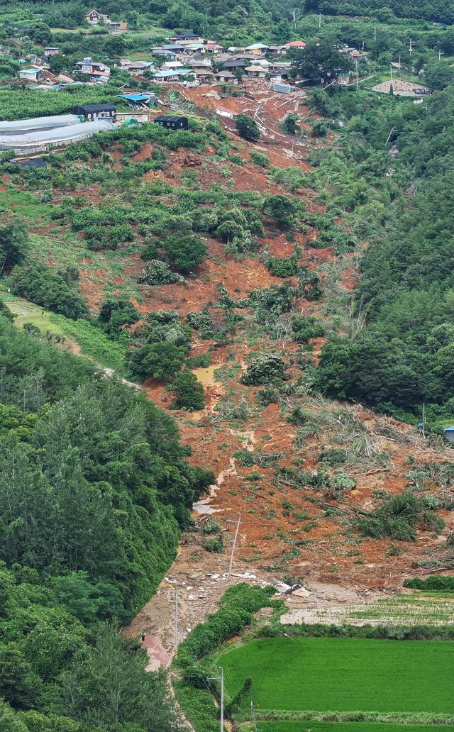 닷새간 중·남부 지역을 중심으로 쏟아진 극한호우로 26명의 인명 피해가 발생한 가운데 지난 봄 대형 산불 피해를 입은 경남 산청에서 또다시 인명·재산 피해가 속출해 안타까움을 더하고 있다. 이날 서울경제신문이 방문한 내부마을 일대는 전날 와룡산 줄기에서 발생한 산사태로 발 디딜 틈이 없을 정도로 난장판이 돼 있었다. 전신주도 무너져 전기도 들어오지 않는 상황에서 주민들은 진흙을 퍼내는 등 수습에 한창이었다. 마을회관으로 가는 길에는 큰 바위가 무너져 도로를 막으며 주민 10여 명이 고립된 것으로 파악됐다. 이에 내부마을 이장 김광만(62) 씨는 “산사태가 났던 1981년 8월 태풍(아그네스) 때 이후로 44년 만에 또다시 이런 대형 참사가 나 참담한 심정”이라고 토로했다.