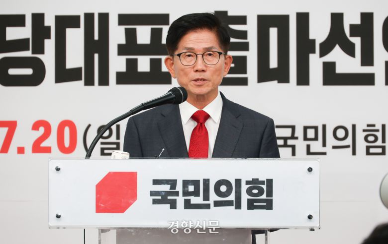 김문수 전 고용노동부 장관이 20일 서울 영등포구 국민의힘 당사에서 8·22 전당대회 당대표 출마를 선언하는 기자회견을 하고 있다. 권도현 기자 |