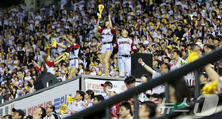(서울=뉴스1) 이승배 기자 = 20일 오후 서울 송파구 잠실야구장에서 열린 프로야구 '2025 신한 SOL뱅크 KBO 리그' 롯데 자이언츠와 LG트윈스의 경기에서 LG 야구팬들이 응원을 펼치고 있다. LG는 구단 역대 최소 경기인 47경기 만에 시즌 100만 관중을 돌파했다. 2025.7.20/뉴스1