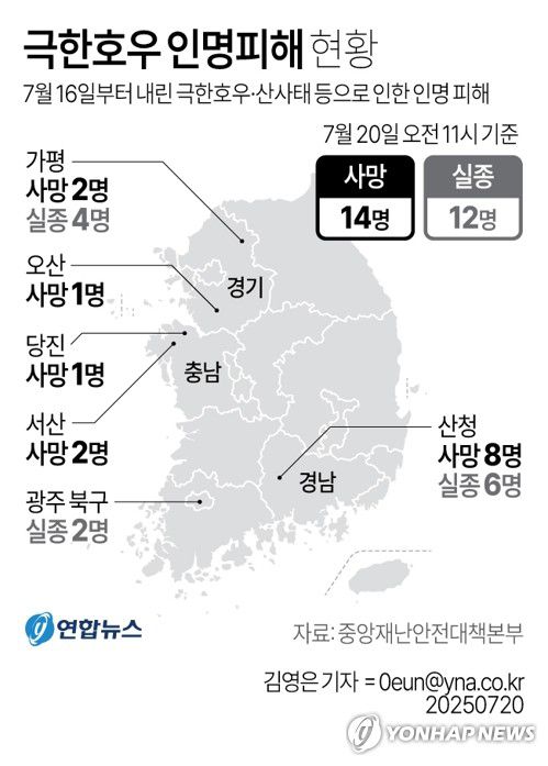 (서울=연합뉴스) 양정우 차민지 기자 = 지난 16일부터 쏟아진 '극한호우'로 닷새간 17명이 숨지고 11명이 실종됐다.