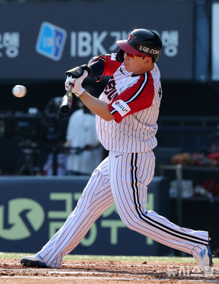 [서울=뉴시스] 배훈식 기자 = 22일 오후 서울 송파구 잠실야구장에서 열린 2025 신한 쏠뱅크 KBO리그 LG 트윈스와 두산 베어스의 경기, 1회말 1사 1루 상황에서 LG 문성주가 안타를 치고 있다. 2025.06.22. dahora83@newsis.com |