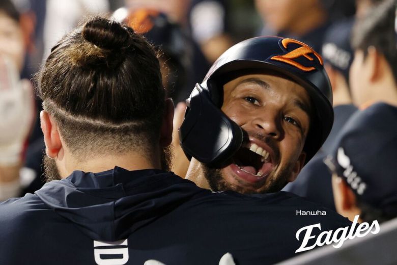 한화 이글스 루이스 리베라토가 20일 수원 케이티위즈파크에서 열린 2025 KBO리그 케이티 위즈와 경기에서 7회초 투런포를 터뜨린 뒤 더그아웃에서 팀 동료 코디 폰세와 포옹하고 있다. 한화 이글스 제공
