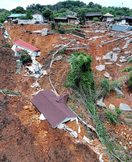 20일 경남 산청군 생비량면 상능마을 일부가 폭우로 인한 산사태로 무너져내렸다. 토사와 함께 집이 흘러 내리면서 잔해만 남았다. [뉴스1] |