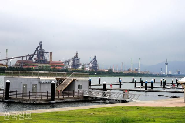 지난 8일 오후 포항 도심을 가로지르는 형산강이 동해와 만나는 강 하구에 자리 잡은 송도동 '형산강 마리나 계류장'에는 배가 한 척도 없었다. 물 위로 보트를 정박하는 시설과 함께 큼지막한 계류장 안내 표지판만 덩그러니 설치돼 있었다.
