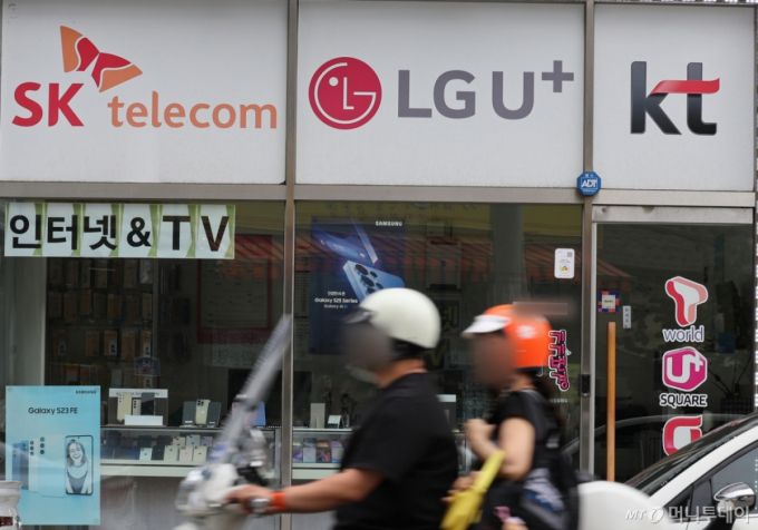 SK텔레콤 사이버 침해 사고 위약금 면제 기한이 하루 앞으로 다가온 13일 서울 서대문구의 한 휴대전화 판매점에 이동통신 3사 로고가 붙어 있다. /사진=뉴시스 |