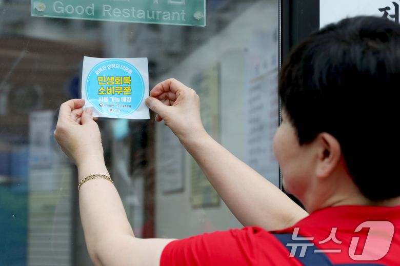 서울 성동구의 한 가게에서 '민생회복 소비쿠폰 사용 가능 매장' 스티커를 부착하고 있다. (성동구 제공. 재판매 및 DB 금지) 2025.7.17/뉴스1 |