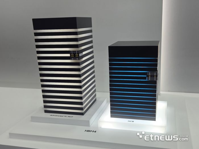 삼성전자 HBM4 모형. 오른쪽 제품이 하이브리드 본딩(HCB) 기술 기반 HBM 모형으로 더 얇은 두께를 구현할 수 있다. (사진=박진형 기자) |