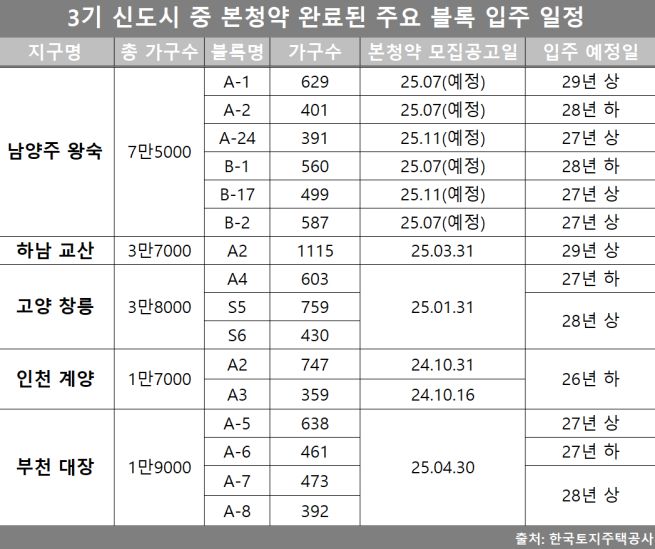 다른 지구들도 비슷하다. 올해 상반기 본청약을 진행한 고양 창릉 4개 블록(1792가구), 하남 교산 A2(1115가구)은 당초 지난해 9월 본청약이 예정됐지만 올해 3월로 미뤄져 2027년 하반기 이후에야 입주가 가능하다. 부천 대장 4개 블록(1964가구)은 지난 4월 본청약을 마쳤으나 역시 2027년 이후 입주가 예상된다.