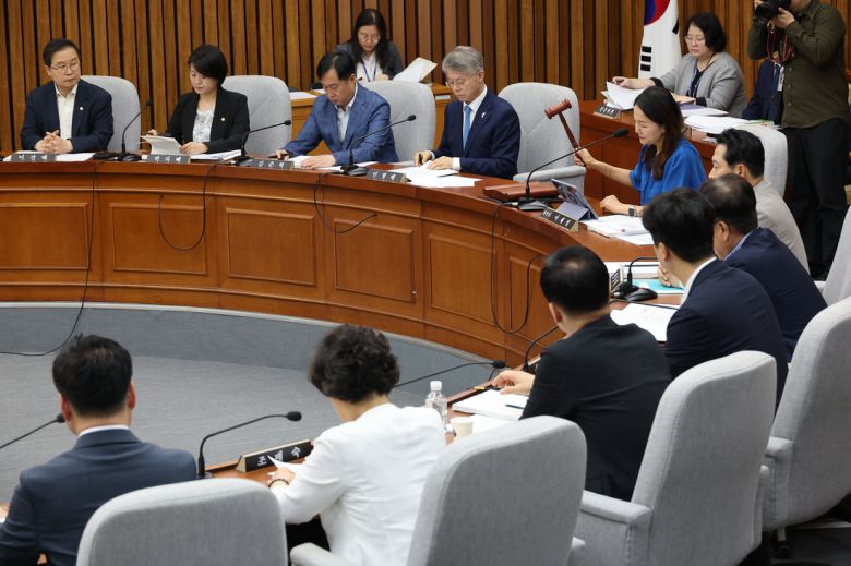 지난 14일 서울 여의도 국회에서 김상환 헌법재판소장 후보자에 대한 인사청문회 실시계획서 채택의 건 등을 의결하기 위해 열린 인사청문특별위원회 전체회의에서 위원장인 더불어민주당 이재정 의원이 의사봉을 두드리고 있다. 연합뉴스 |