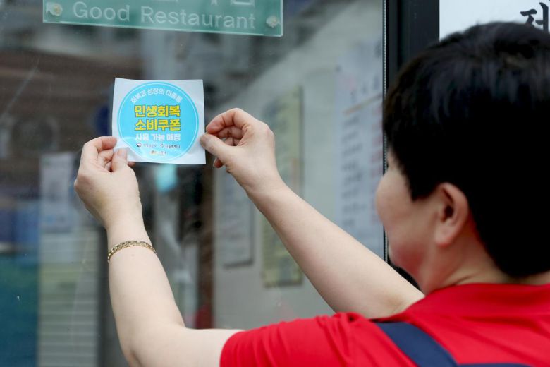 서울 성동구의 한 가게에서 ‘민생회복 소비쿠폰 사용 가능 매장’ 스티커를 부착하고 있다. 성동구 제공. 2025.7.17/뉴스1 |