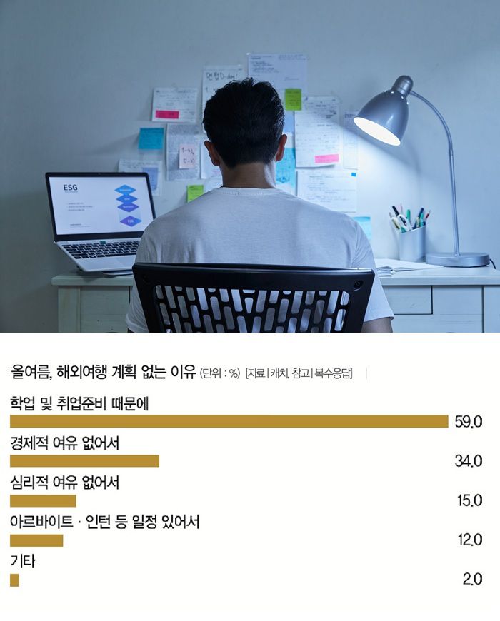 올여름 해외여행 계획 여부를 묻는 질문에는 64.0%가 '계획이 없다'고 답했다. 해외여행 계획이 있는 경우는 36.0%였다. 해외여행 계획이 없는 이유로는 '학업 및 취업 준비(59.0%ㆍ복수응답)'가 압도적이었다. 다음으로 '경제적 여유 부족(34.0%)' '심리적 여유 부족(15.0%)' '아르바이트ㆍ인턴 등 일정이 있어서(12.0%)' 등의 의견도 있었다.