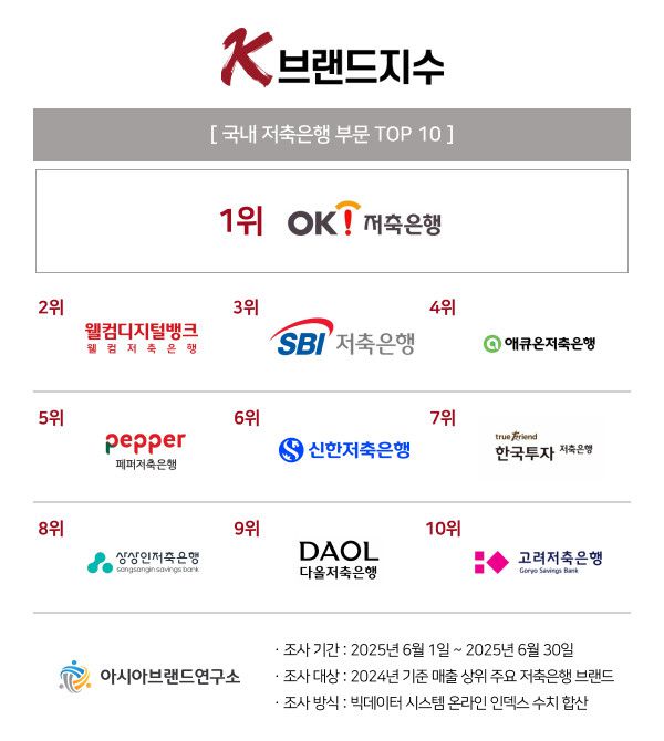 이번 저축은행 부문은 2024년 기준 매출 상위 주요 저축은행 브랜드를 대상으로 지난 6월1~30일 온라인 빅데이터 9884만6513건을 분석해 진행됐다.