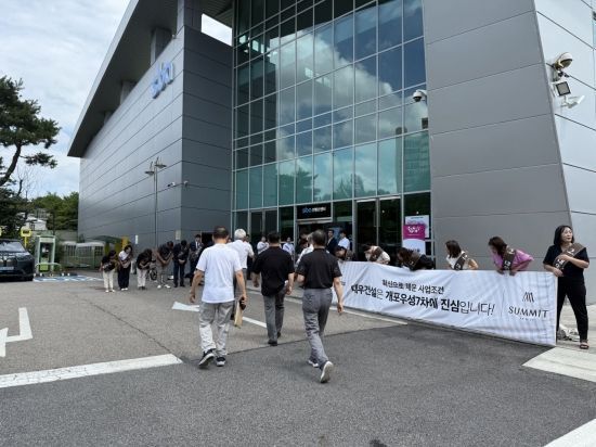 이날 서울 강남구 대치동 세텍 컨벤션센터에서는 설명회를 들으러 온 조합원들로 발 디딜 틈이 없었다. 늦게 도착한 조합원들은 간이 의자나 계단에 앉아서 설명을 듣기도 했다. 행사장 입구부터 시공사 홍보요원들이 두 줄로 도열해 대형 현수막을 펼쳐 들고 '안녕하십니까, 열심히 하겠습니다'라며 조합원들에게 큰 목소리로 인사했다.