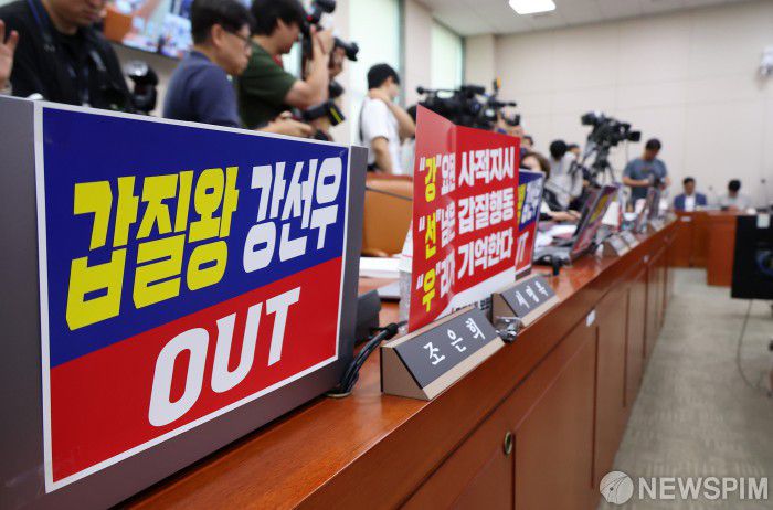 [서울=뉴스핌] 정일구 기자 = 14일 오전 서울 여의도 국회 여성가족위원회에서 열린 강선우 여성가족부 장관 후보자 인사청문회가 정회한 가운데 국민의힘 의원석에 '갑질왕 강선우 OUT' 피켓이 붙어 있다. 2025.07.14 mironj19@newspim.com