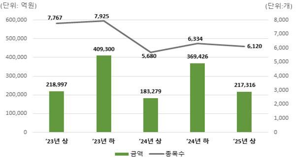 한국예탁결제원은 21일 공개한 ELS 발행 현황에 따르면 ELS에 묶인 자금인 발행 잔액은 올해 상반기 53조 5548억 원으로 집계됐다. ELS 발행 잔액은 작년 상반기와 비교해 5.5% 증가했다. 예탁결제원의 ELS 집계는 주가연계사채(ELB)를 포함한다.