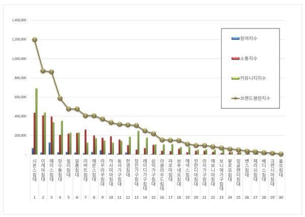 침대 브랜드평판 1위를 기록한 시몬스침대 브랜드는 참여지수 70,002 소통지수 436,452 커뮤니티지수 692,236이 되면서 브랜드평판지수 1,198,690으로 분석됐다. 지난 6월 브랜드평판지수 947,782와 비교해보면 26.47% 상승했다.