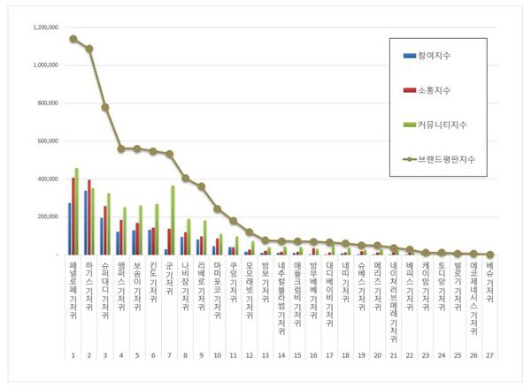2위, 하기스 기저귀 브랜드는 참여지수 340,341 소통지수 395,268 커뮤니티지수 353,041이 되면서 브랜드평판지수 1,088,650으로 분석됐다. 지난 6월 브랜드평판지수 949,876과 비교해보면 14.61% 상승했다.