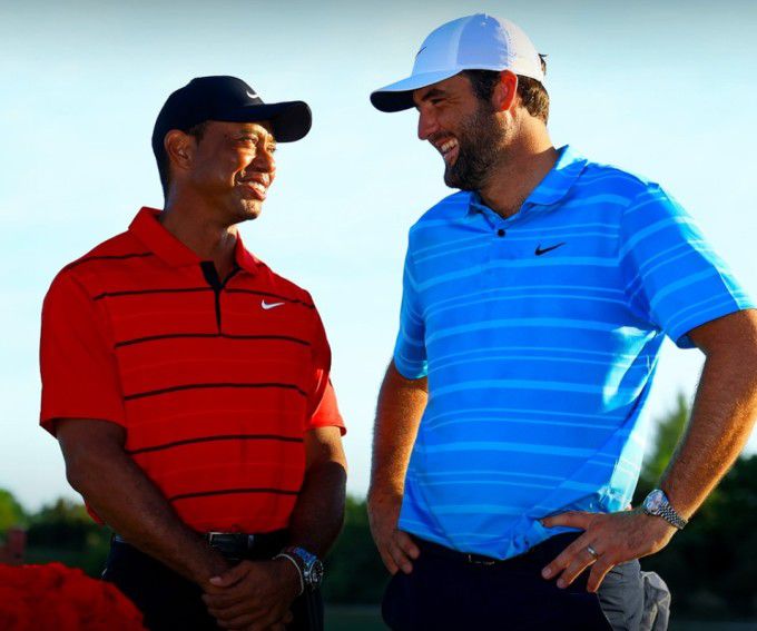타이거 우즈(왼쪽)와 스코티 셰플러. [사진=PGA]