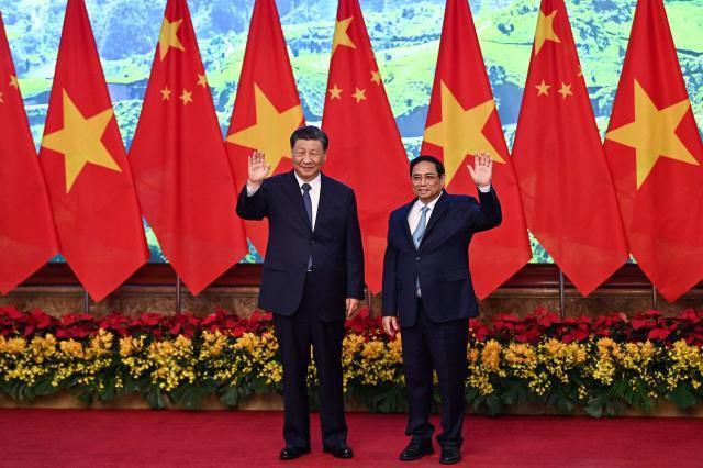 2023년 12월 시진핑 중국 국가주석(왼쪽)과 팜민찐 베트남 총리가 하노이 정부청사에서 회담에 앞서 손흔들어 인사하고 있다. [사진=AFP·연합뉴스] |