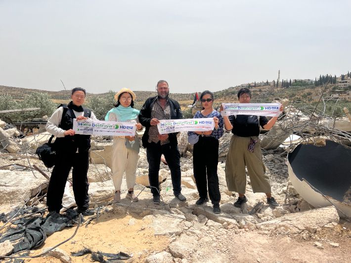 지난 5월 5일, 팔레스타인 서안지구 알 무카이르(Al-Mughayyir)에서 HD현대의 불도저가 팔레스타인 주민의 집을 파괴했다. 이스라엘점령군은 이른 아침 마을을 습격하고 모든 입구를 봉쇄한 뒤 팔레스타인 가옥 파괴를 시작했고, 모인 마을 청년들을 구금했다. 부서진 집 잔해 위에서 피해자 모하메드(가명)씨가 팔레스타인평화연대 활동가들과 함께 HD현대에 이스라엘과의 공모를 중단하라는 배너를 들고 있다.  자아 활동가 제공