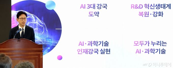 (세종=뉴스1) 김기남 기자 = 배경훈 과학기술정보통신부 장관이 17일 정부세종청사 과기정통부 대강당에서 열린 취임식에서 취임사를 하고 있다. 2025.7.17/뉴스1 Copyright (C) 뉴스1. All rights reserved. 무단 전재 및 재배포, AI학습 이용 금지. /사진=(세종=뉴스1) 김기남 기자