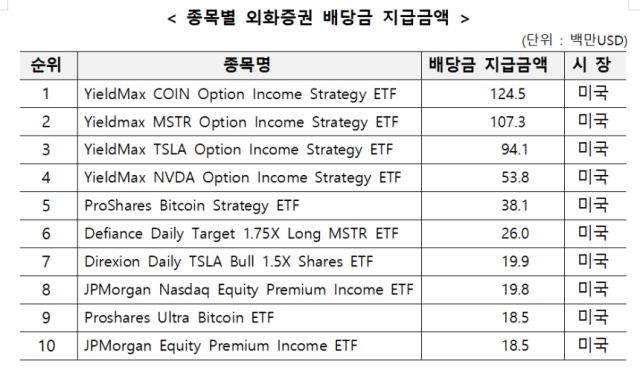 일본 시장은 올해 상반기 5200만 달러를 배당해 5.2% 비중으로 2위였고, 그 외 시장은 개별 비중이 1%에 미치지 못했다.배당금 지급이 가장 많았던 10개 종목은 모두 미국 ETF 상품이었다. 1위는 암호화폐 거래소인 코인베이스 주식을 기초자산으로 하는 ‘일드맥스 코인 옵션 인컴 전략’ ETF(CONY)로 배당금이 약 1억 2450만 달러(약 1734억 원)에 달했다.