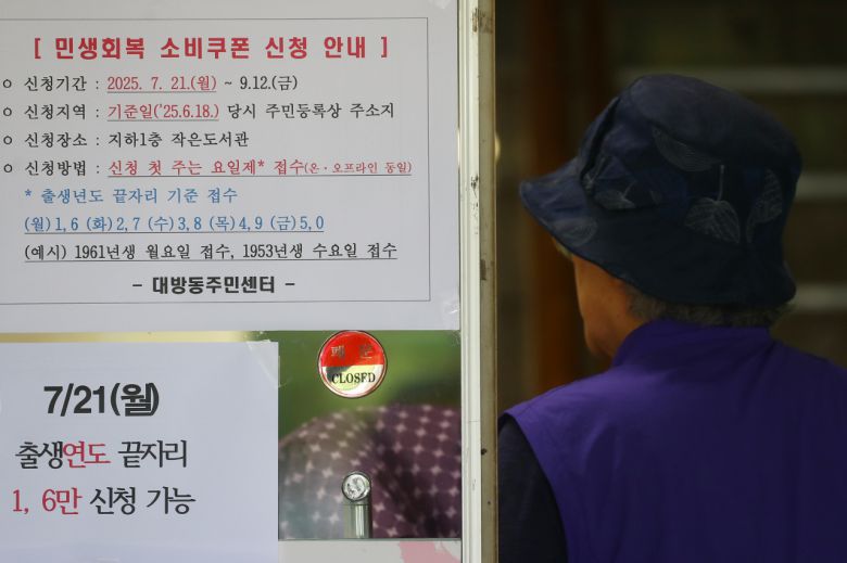 행정안전부에 따르면 이날 오전 9시부터 소비 활성화와 소상공인 및 자영업자 매출 확대를 위한 '민생회복 소비쿠폰'의 발급이 시작됐다. 신청 첫 주(7월 21일~25일) 동안은 온·오프라인 모두 출생년도 끝자리에 따라 1·6(21일), 2·7(22일), 3·8(23일), 4·9(24일), 5·0(25일) 순으로 진행되며, 이후에는 자유롭게 신청이 가능하다.