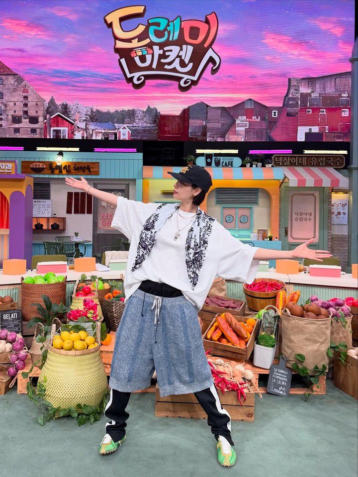 예능 촬영 현장에서 나나는 박시한 흰색 티셔츠에 블랙-화이트 스카프를 걸치고, 배기핏 데님 반바지와 트레이닝 팬츠를 레이어드했다. 여기에 형광 포인트 운동화를 매치해 독특한 믹스매치 룩을 완성했다.