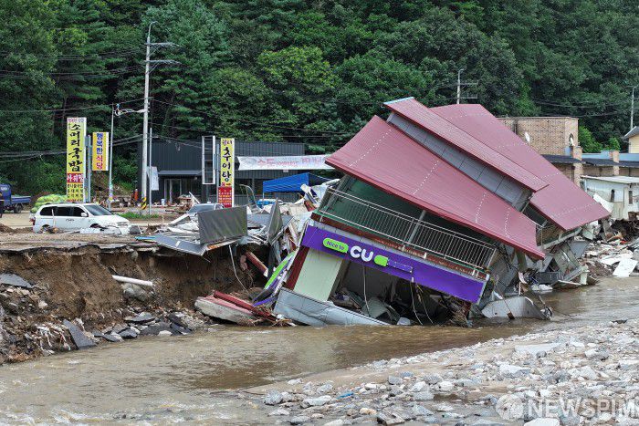 [가평=뉴스핌] 이형석 기자 = 21일 오후 경기 가평군 조종면 일대 편의점이 지난밤 쏟아진 집중호우에 지반이 무너져 파손되어 있다. 현재 가평지역에는 사망 2명, 실종자 9명 등 인명피해가 발생했다. 2025.07.21 leehs@newspim.com