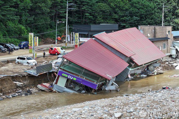 [가평=뉴스핌] 이형석 기자 = 21일 오후 경기 가평군 조종면 일대 편의점이 지난밤 쏟아진 집중호우에 지반이 무너져 파손되어 있다. 현재 가평지역에는 사망 2명, 실종자 9명 등 인명피해가 발생했다. 2025.07.21 leehs@newspim.com