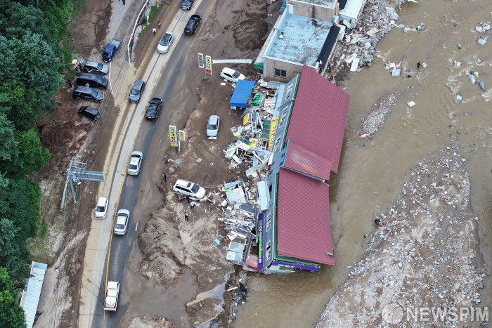 [가평=뉴스핌] 이형석 기자 = 21일 오후 경기 가평군 조종면 일대 편의점이 지난밤 쏟아진 집중호우에 지반이 무너져 파손되어 있다. 현재 가평지역에는 사망 2명, 실종자 9명 등 인명피해가 발생했다. 2025.07.21 leehs@newspim.com