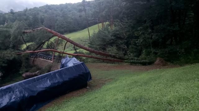 경기 남양주시 봉선사 내 소나무가 쓰러져 큰 법당의 기와가 파손됐다. 국가유산청 제공 |