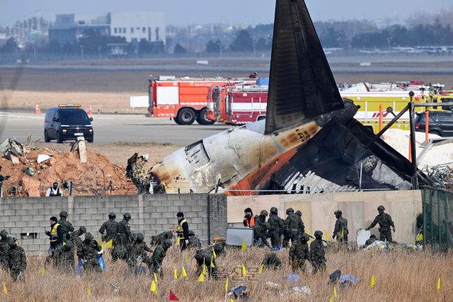 30일 오전 전남 무안국제공항에서 군인들이 전날 발생한 제주항공 여객기 충돌 폭발 사고 잔해를 수색하고 있다. 2024.12.30 무안 도준석 전문기자 |
