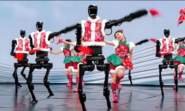 중국 CCTV 설 특집 공연인 '춘완'에서 유니트리 H1 로봇들이 인간 무용수와 함께 춤을 추고 있다. [사진=CCTV]