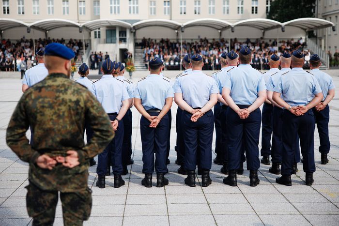 20일(현지시간) 독일 베를린에서 군에 입대한 신병들이 행사 중 선서를 하기 위해 모여 있는 모습. [사진 출처 = EPA, 연합뉴스]
