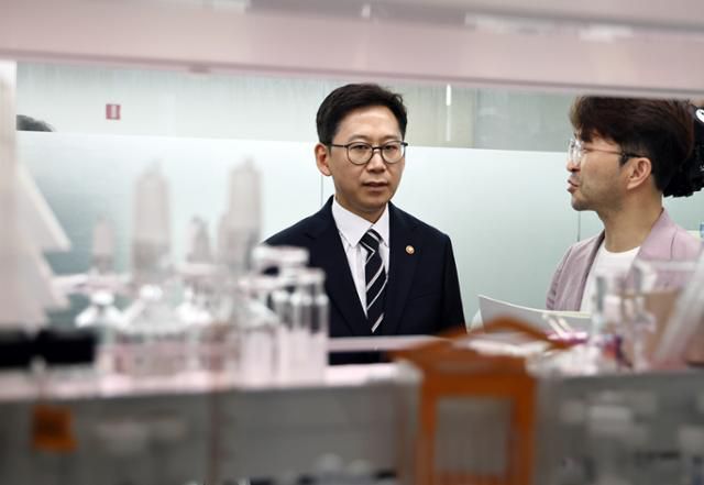 배경훈(왼쪽) 과학기술정보통신부 장관이 21일 오후 서울 동대문구 서울바이오허브에 입주한 한 바이오 기업을 찾아 둘러보고 있다. 뉴스1 |