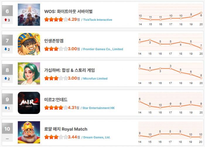 ‘로얄킹덤’은 지난주와 마찬가지로 5위를 안정적으로 유지했고, ‘WOS: 화이트아웃 서바이벌’은 순위를 끌어올리며 6위에 안착했다.