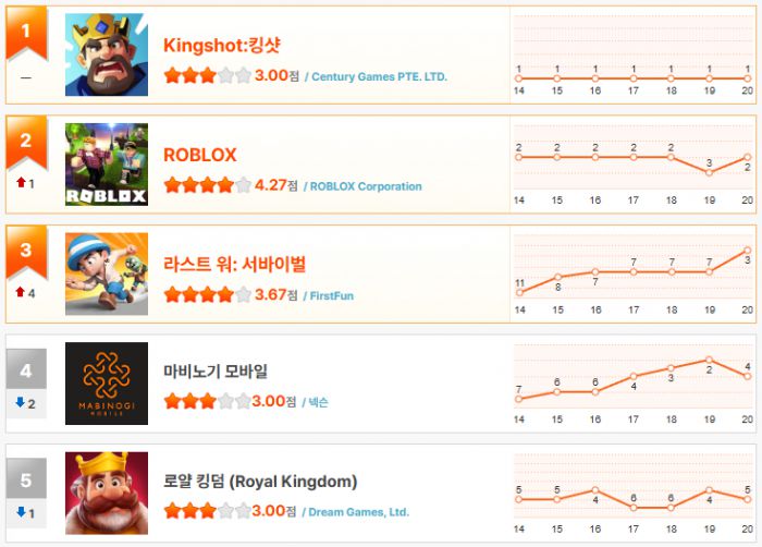 2025년 7월 3주차 헝그리앱 랭킹에서 ‘킹샷’이 2주 연속 1위를 수성하며 왕좌를 지켜냈다. 방학 시즌의 강자 ‘로블록스’도 탄탄한 인기 속에 2위 자리를 굳건히 지켰다. 특히 초등학생 유저들의 절대적인 지지 덕분에, 여름마다 급등하는 특유의 순위 상승세가 이번에도 이어졌다.