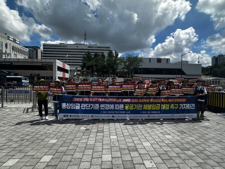 양대노총 공대위는 21일 서울 용산 대통령 집무실 앞에서 기자회견을 열고 지난해 대법원의 통상임금 확대 판결을 제대로 현실에 반영하지 않는 공공기관들을 규탄하며, 기획재정부에 총인건비제 개혁을 요구했다.