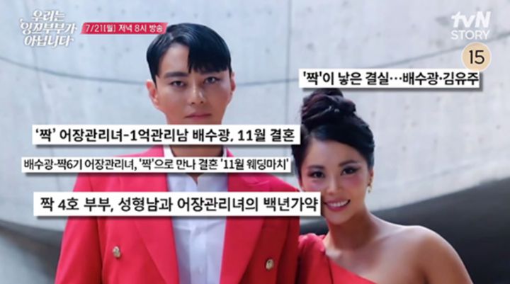 (MHN 장지원 인턴기자) tvN STORY 부부 고민 드라마 테라피 '우리는 잉꼬부부가 아닙니다'에 '짝' 출연으로 인연을 맺고 결혼한 배수광, 김유주 부부가 등장해 충격적인 근황을 공개한다.