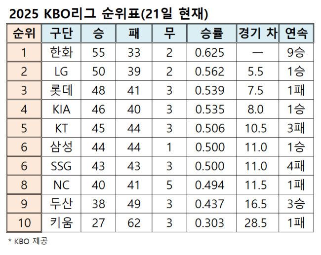 프로야구 순위표(21일 현재)
