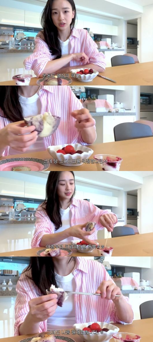 손연재는 베이글에 크림치즈를 듬뿍 바르며 “당 스파이크를 걱정한다면서 아침부터 크림치즈를 듬뿍. 그래도 나름 절제했다. 블루베리는 못 참는다”라고 설명, 웃음을 참지 못했다.
