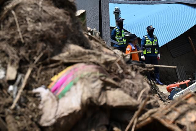 21일 경찰 과학수사대가 경기 가평군의 수해 현장을 살펴보고 있다. 연합뉴스