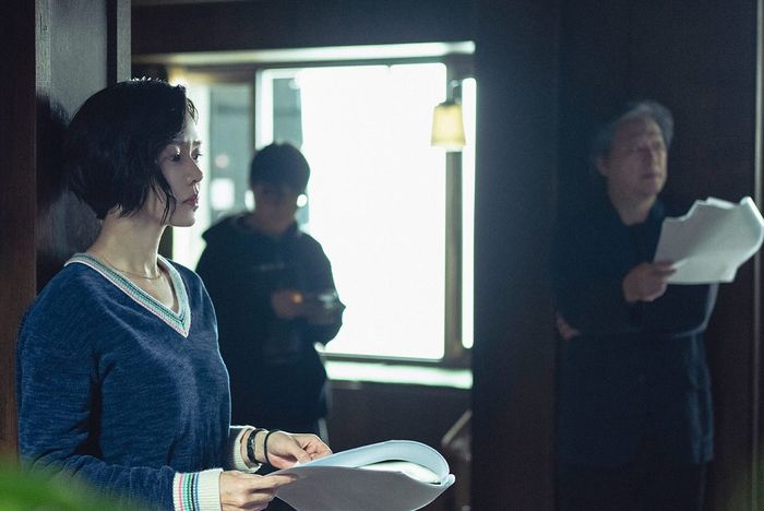 사진은 실내에서 모니터링 또는 회의를 진행하는 장면이 담겨, 영화 현장의 진지하고 열정적인 분위기가 전해진다.