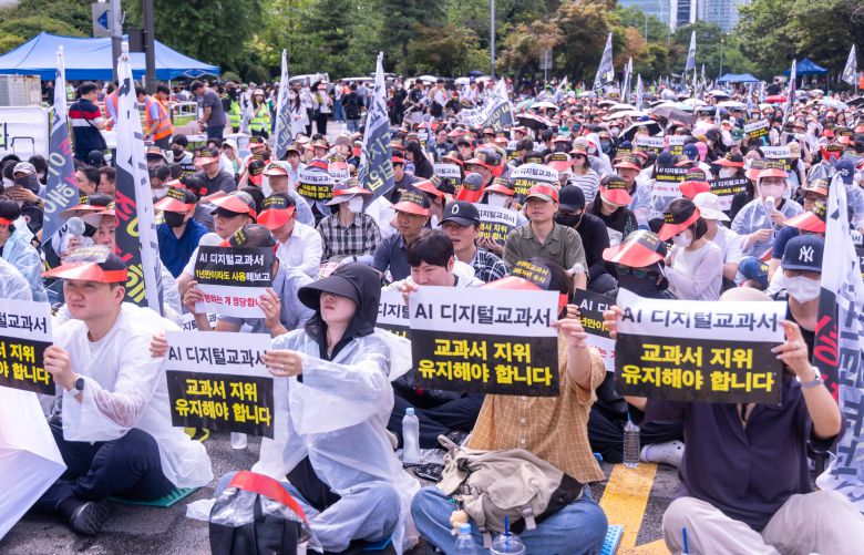 박정과 천재교과서 대표는 집회 연단에 올라 “출판인들이 국회 앞에 모인 건 역사상 처음”이라며 “정부를 믿고 AI 교과서 개발에 수천억 원을 투자했는데, 이제 와서 교육 자료로 지위를 바꿔버리면 어떡하라는 거냐”고 호소했다.
